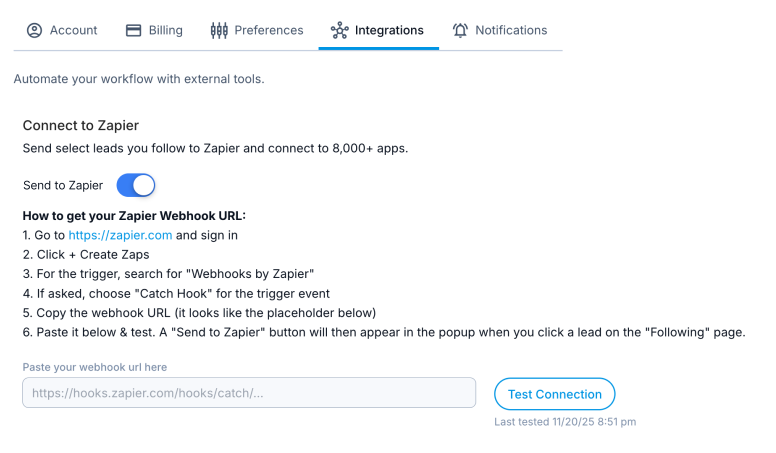 This problem is a good example of “sometimes the best solution to a big problem is the simplest.” Building out additional functionality like some sort of CRM tooling to solve it would have been costly and undesirable. So, I decided to focus on integration as a swift means to satisfy both needs. In under an hour, I implemented a webhook-based integration with Zapier, allowing users to push leads into the tools they already rely on with a single click. Tools like HubSpot, Gmail, Mailchimp, and thousands of others were now at their fingertips with super simple setup instructions and connection testing. This approach enabled immediate action, respected existing workflows, and added meaningful value without increasing UI complexity.
